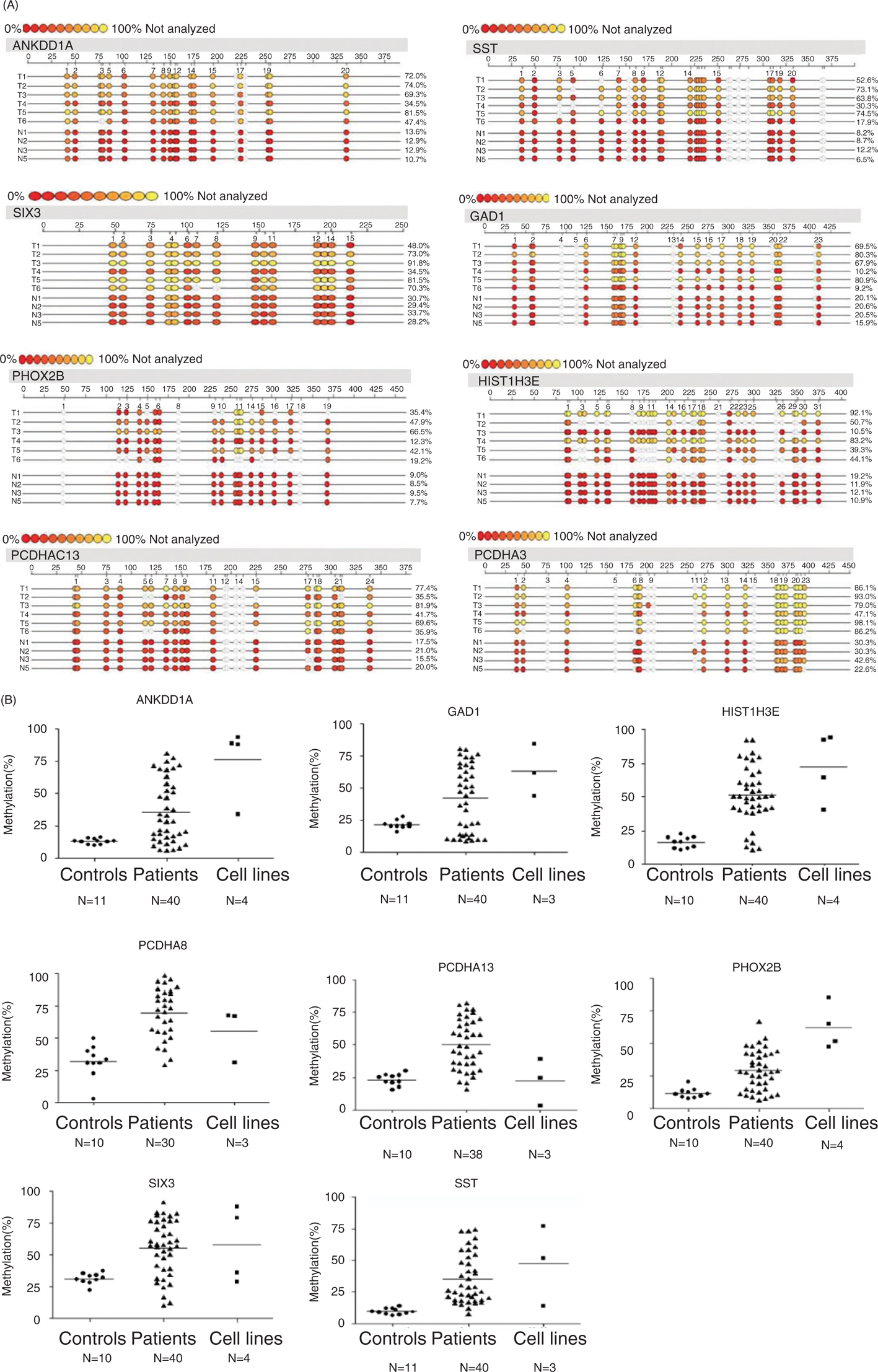 Figure 2 MassARRAY methylation analysis for glioblastoma. (A) MeDIP-chip assay detected hypermethylation genes’ promoter methylation levels. Mass ARRAY assay were carried out using patients’ samples gDNA screened by microarray. The position of CpG dinucleotides were marked by circles within the sequence (straight line), and the methylation levels were marked by different circle colors. Gray circles represent CpG sites that could not be analyzed. The base-pair position in the gene sequence used the ruler on top and CpG sites number at the bottom. In all tested genes, glioma samples have significant hypermethylation in promoter regions compared with normal controls. N1, N2, N3, and N5 represent normal brain, while T1, T2, T3, T4, T5, and T6 represent glioma samples. Glioma samples and normal samples were matched for age and sex. (B) Methylation levels of eight selected genes were identified by MeDIP-chip in glioma patients, normal controls, and glioma cell lines. DNA methylation was analyzed using MassARRAY assay. The gene names were marked in the top of each graph. N represents the number of cases for this research. In the top of each graph, the results of an individual gene are represented (20).