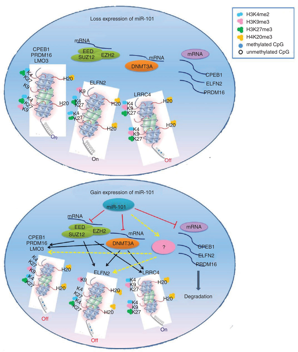 Figure 4 The networks of miRNA, gene methylation, and histone modification in glioblastoma. The hypomethylated genes CPEB1, PRDM16, and ELFN2 are target genes of miR-101, but LMO3 is not, and the expression of CPEB1, PRDM16, and ELFN2 are inhibited directly by miR-101. Moreover, miR-101 also indirectly suppresses the expression of CPEB1, ELFN2, PRDM16, and LMO3 and affects their methylation levels by targeting EZH2, EED, and DNMT3A and regulating histone methylation; miR-101 decreases the occupancy of H3K4me2 and H3K27me3 at CPEB1, ELFN2, PRDM16, and LMO3 core promoter and increases the H3K9me3 and H4K20me3 occupancy at CPEB1, PRDM16, and LMO3 core promoter by targeting EZH2, EED, and DNMT3A; then, it recovers the methylation levels of CPEB1, ELFN2, PRDM16, and LMO3 gene promoter, and indirectly downregulates the expression of these hypomethylation genes. miR-101 does not bind to 3,UTR of hypermethylated gene LRRC4, but it remains to upregulate the expression of LRRC4. miR-101 decreases the occupancy of H3K27me3 at LRRC4 core promoter and induces hypomethylation of LRRC4 by targeting EZH2, EED, and DNMT3A. In short, miRNAs can not only directly regulate expression of hyper-/hypo- methylation genes by binding to 3’-UTR of genes but also regulate the methylation level and gene expression through histone and DNA methylation modification by targeting histone and DNA methyltransferases (Xiaoping Liu. Docotor’s thesis. Central South University, 2012).