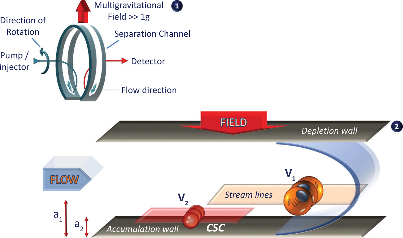Field-flow fractionation (FFF) techniques were developed by J.C. Giddings in the late 1960s (54). FFF methods are considered as gentle methods as cells are sorted by applying low-intensity forces: (i) one corresponding to an external multigravitational field due to the channel rotation and (ii) the other corresponding to hydrodynamic lift-forces due to the flowing of the cells in the mobile phase (Figure 1). The balance of these two forces leads to the focusing of identical subpopulations (with respect to size, density, shape, and rigidity) into thin layers, which are eluted from the flow stream passing through their gravitational center (hyperlayer elution mode) (55). Sedimentation field-flow fractionation (SdFFF) is a gentle (low flow rate and low external field to limit shear forces exerted on cells) and noninvasive method, which takes into account, without any labeling, a complex matrix of cell properties such as the size, the cell-cycle position (related to the density), or the rigidity of the cytoskeleton, which are the major properties of stem cells. Usually, the largest and less dense cells (the most differentiated) are eluted first, while the smallest and the most dense cells (low nucleo-cytoplasmic ratio corresponding to stems cells) are eluted last. This elution order also depends on the ploidy or the position in the cell cycle; the cells eluted in the last fraction are usually in the G0/G1 phase (56, 57).