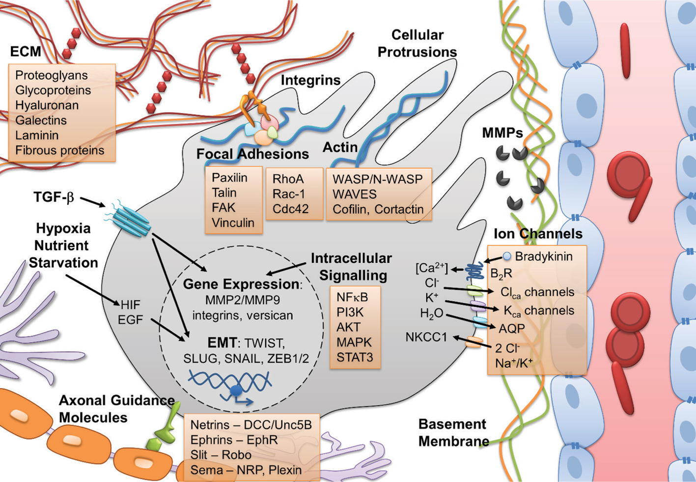 Figure 1 Mechanisms involved in the migration and invasion of glioblastoma (GBM). The migrational phenotype of GBM cells is regulated by a complex interplay of different factors, signaling cascades, as well as cellular and environmental features.