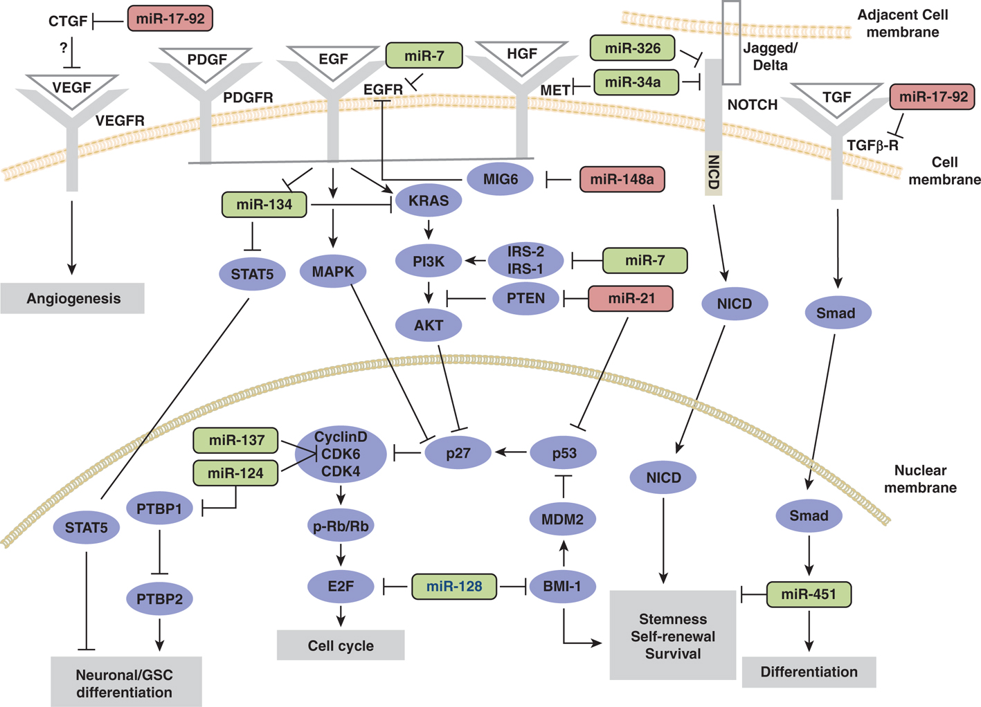 MiR-34a is a downregulated miRNA in GBM that directly inhibits the expression of MET, NOTCH1, NOTCH2, CDK6, CCND1, and SIRT1 (35, 75–77). MET is a commonly overexpressed and activated RTK in GBM and is responsible for mediating multiple growth-signaling pathways. NOTCH is a critical regulator of cell fate and cancer stem cell maintenance (56–58). CDK6 and CCND1 are well-known cell-cycle regulators. By targeting these important molecules involved in cell proliferation, miR-34a inhibits cell survival, proliferation, and invasion, as well as GSCs self-renewal (35, 55).RTKs are co-deregulated in the majority of GBM. MiR-134 is upregulated in human tumors and GSCs and is regulated by the RTKs, MET, EGFR, and PDGFR (19). MiR-134 inhibits GSCs self-renewal, survival, and xenograft growth and induces GSC differentiation by directly binding to KRAS and STAT5B 3′ UTRs. MiR-134 therefore represents an RTK-regulated tumor-suppressive hub that mediates RTK effects on GBM malignancy.