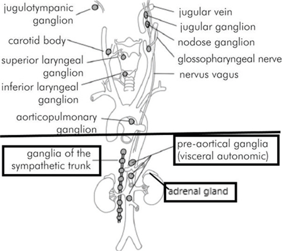 Figure 1 Anatomical localization of the paraganglia and of the adrenal glands. Paragangliomas arising in ganglia of the sympathetic trunk, pre-aortical ganglia, and adrenal glands are reviewed in this chapter.
