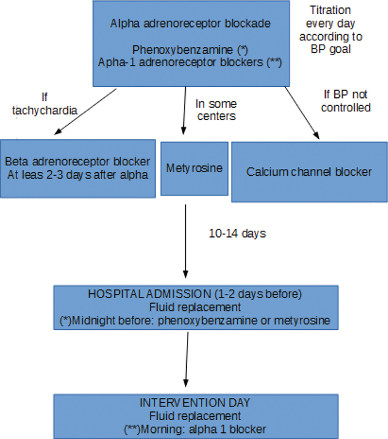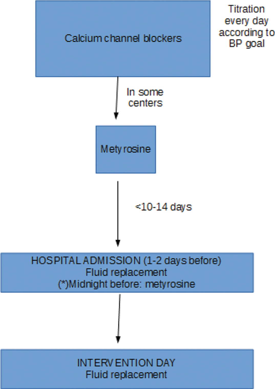 In most centers, the patient is admitted the day before surgery. Depending on previous therapy and on the institution, pharmacological management may differ. Usually, if treatment is with phenoxybenzamine or metyrosine, the last dose is administered the midnight before surgery. When alpha-1 blockers, which have shorter action, are used, the last dose should be administered the same day of surgery (Figure 2). The patient should be instructed to stay in bed with the rails raised to prevent fall due to hypotension. Continuous administration of 0.9% saline (1–2 L) should be started the evening before surgery to expand the intravascular volume and reduce frequency and severity of hypotension. Volume expansion may be contraindicated in patients with congestive heart failure or renal insufficiency. In patients with resistant hypertension o hypertensive crisis, sodium nitroprusside and labetalol or phentolamine should be necessary (4, 6, 8, 9).