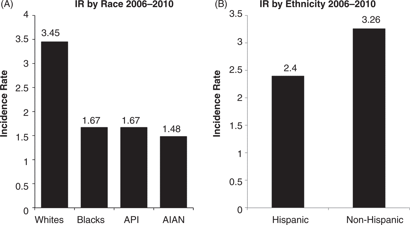 Figure 2 (A) Average annual age-adjusted incidence rates of glioblastoma by race, CBTRUS statistical report: NPCR and SEER, 2006 to 2010. X-axis, race; Y-axis, incidence rates. (B) Average annual age-adjusted incidence rates of glioblastoma by ethnicity, CBTRUS statistical report: NPCR and SEER, 2006 to 2010. X-axis, ethnicity; Y-axis, incidence rates. Rates are per 100,000. AIAN, Asian Indian Alaskan Native. (Adapted from Ref. (11).)