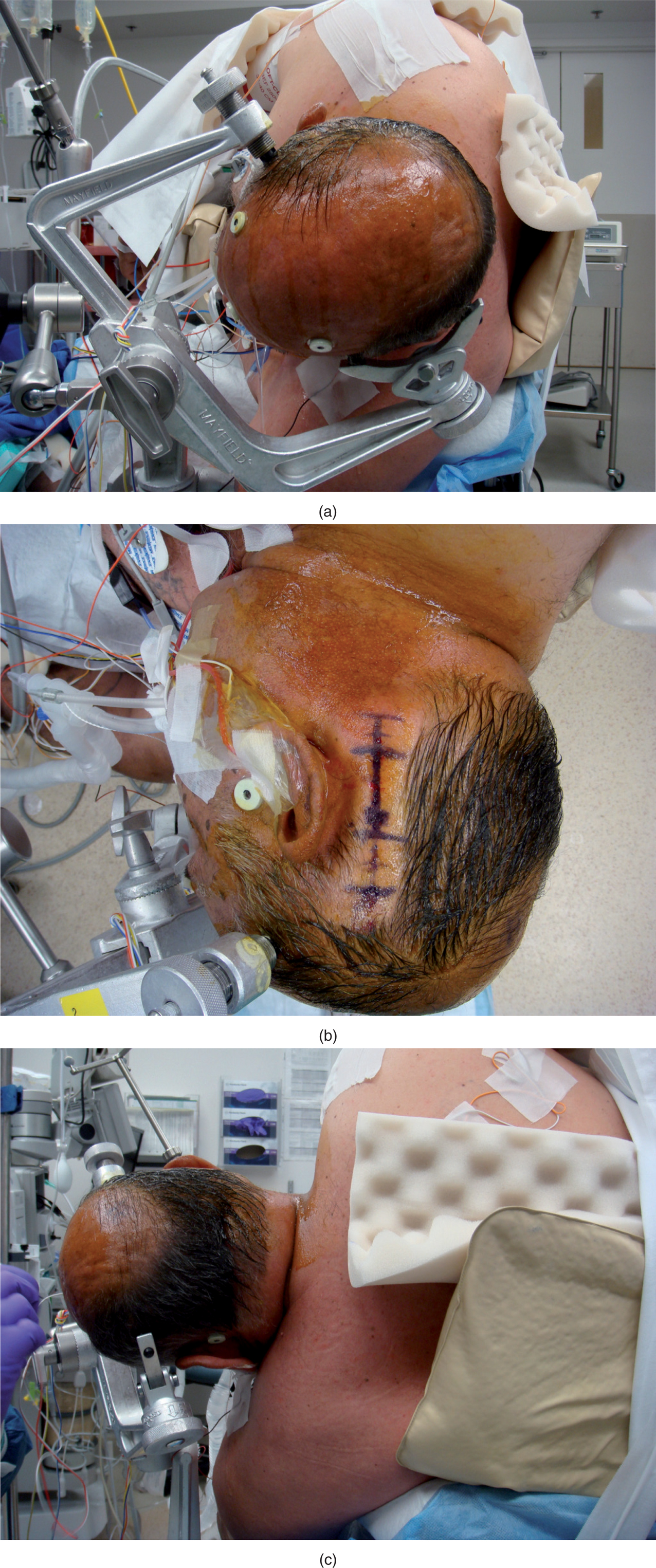 Figure 4 Head-fixation system is recommended when the neuronavigation system is used. The head clamp must be firmly secured to the skull. Special attention is required when awake craniotomy is performed (a). Head rotation should be limited to the patient’s cervical spine condition and to avoid reducing venous return (b). The head must be maintained above the heart level to reduce bleeding (c). (Courtesy of Prof. Alfredo Quiñones-Hinojosa.)