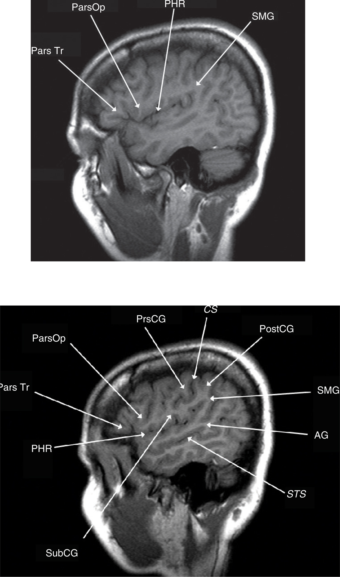 Figure 3 Lateral sagittal T1-weighted MRI scans. Pars triangularis (Pars Tr), pars opercularis (Pars Op), posterior horizontal ramus of the sylvian fissure (PHR), and supramarginal gyrus (SMG). Subcentral gyrus (SCG), precentral gyrus (PCG), central sulcus (CS), postcentral gyrus (PoCG), supramarginal gyrus (SMG), angular gyrus (AG), and superior temporal sulcus (STS).