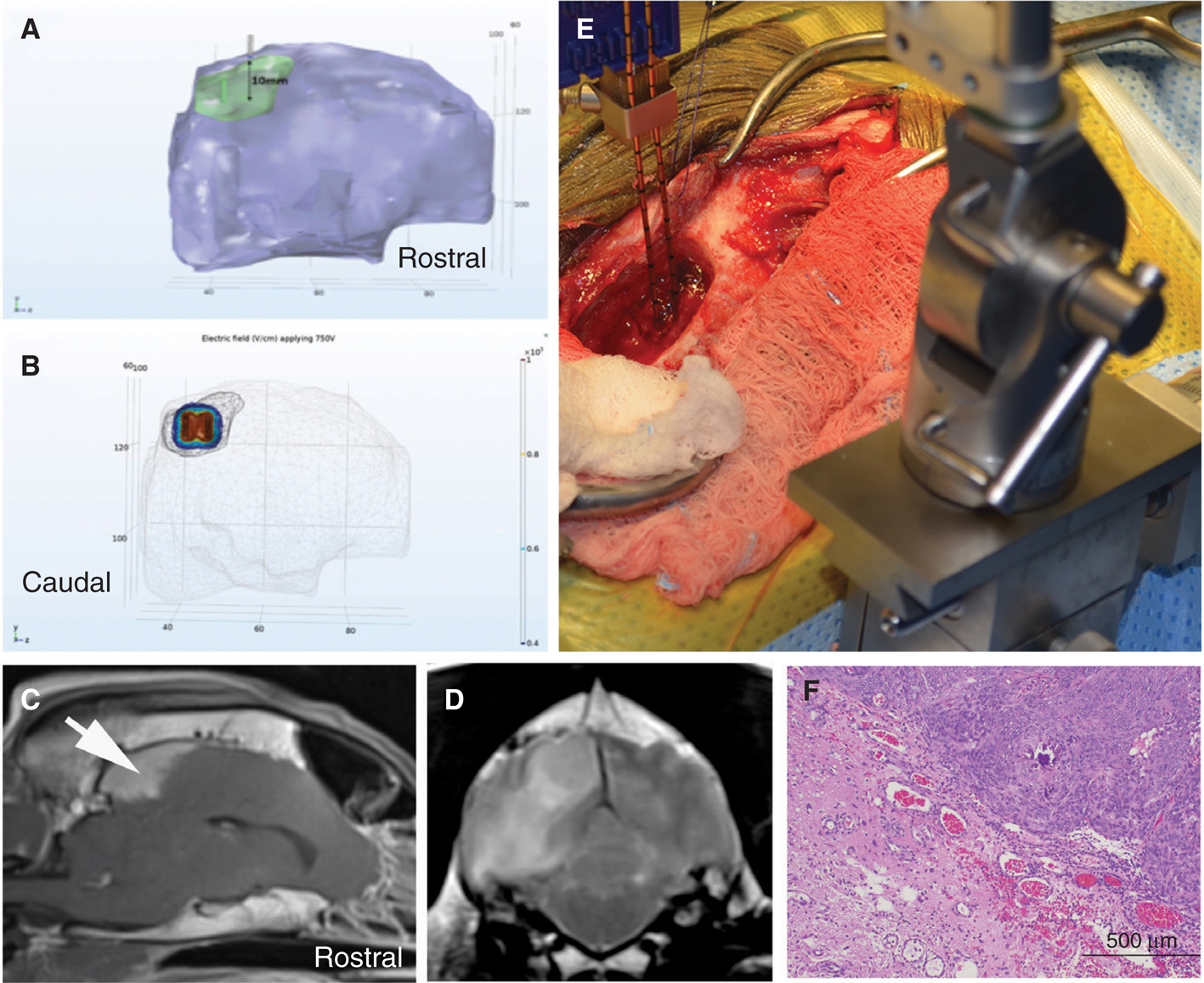 Figure 4 High-frequency irreversible electroporation (H-FIRE) treatment of a canine Type I parasagittal meningioma. Treatment planning (A, B) involves segmentation of the tumor (green) and brain (purple) from the patient’s MR images (C, D), and determination of the electrode placement trajectory (A). The resulting electric field distributions are then simulated (B) using finite element analysis software (B). The H-FIRE electrodes are placed using intraoperative stereotaxy (E) according to the treatment plan, and the pulses delivered. After-HFIRE treatment, the tumor was resected and serially sectioned to correlate the predicted with actual ablation volume. Photomicrograph of the treatment margin (F), illustrating a sharp line of demarcation between H-FIRE ablated (lower left) and viable tumor (upper right); H&E stain.