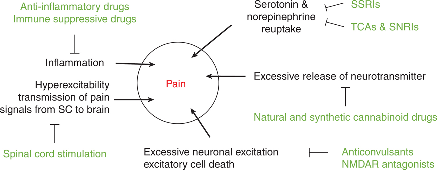 Figure 1 Disruption of MS pain signals by different treatments. Signals in the CNS (brain and spinal cord) and the PNS contribute to the development of neuropathic pain. Different therapies interfere with pain signals (black) and can lead to the alleviation of neuropathic pain. Antidepressants (TCAs, SNRIs, and SSRIs) inhibit the reuptake of serotonin alone or serotonin and norepinephrine, the key neurotransmitters that are hypothesized to be involved in the modulation of neuropathic pain. Natural and synthetic cannabinoid drugs prevent the excessive release of neurotransmitters in the CNS. Anticonvulsants and NMDAR antagonists block excessive neuronal excitation that may lead to excitatory cell death. Spinal cord stimulation blocks hyperexcitability of neurons in the spinal cord and prevents transmission of pain signals from the spinal cord to the brain. Recently, anti-inflammatory drugs were investigated that block inflammatory signaling associated with development of chronic pain.