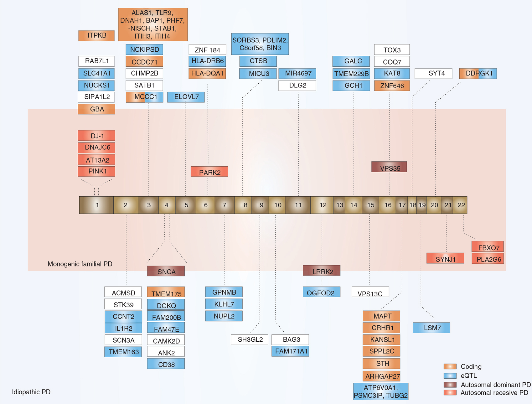 Figure 1 Insights into the genetics of Parkinson’s disease (PD). The largest meta-analyses until now have identified 41 PD-risk loci (12, 13). Candidate genes are annotated for each region that has been significantly associated with PD. For some of the regions, there is more than one candidate gene.