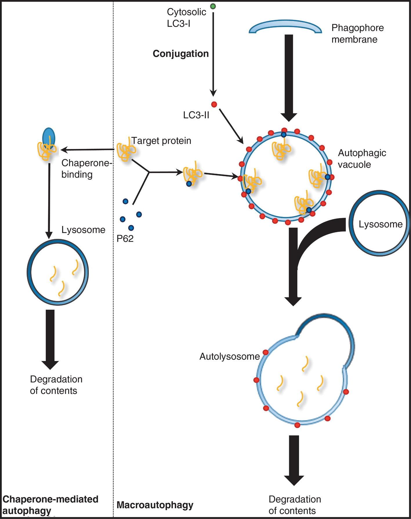 Figure 2 Macroautophagy and chaperone-mediated autophagy pathways. During macroautophagy, phagophore membrane fragments form autophagosomes. During this process, the protein LC-3 is conjugated. Proteins are targeted to the autophagosome, which involves the protein P62. The autophagosome fuses with the lysosome to form an autolysosome, and the contents are degraded by lysosomal enzymes. In chaperone-mediated autophagy, proteins for removal bind to protein chaperones, which help to target them directly to the lysosome for enzymatic degradation. Together, these mechanisms constitute important pathways for α-synuclein clearance.