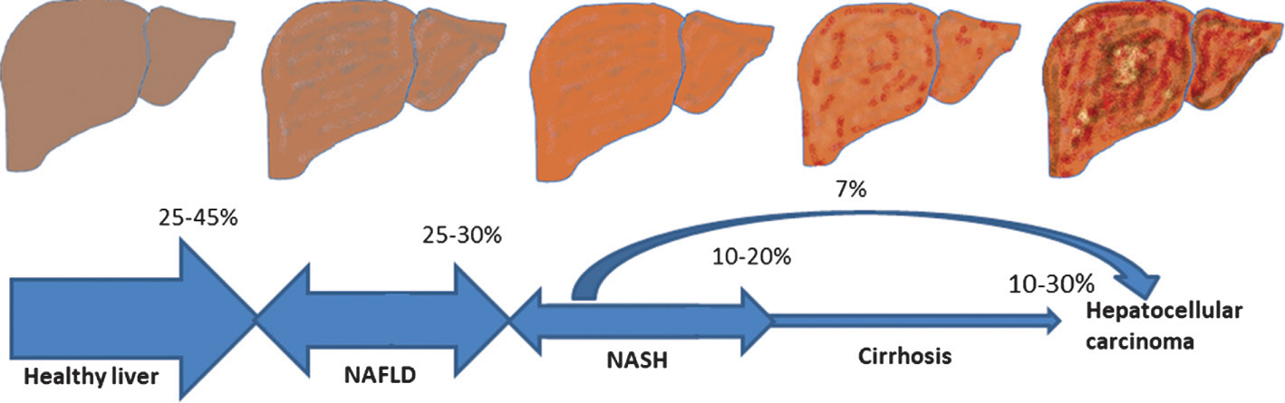 The pathophysiology of metabolic syndrome is complex and involves multiple organ systems, but in the liver the presence of excess fat promotes inflammation and can lead to cycles of liver cell injury and repair. Damage to the liver is often progressive and can result in fibrosis and eventually cirrhosis, but the process is often partially reversible at the early stages with changes in diet and lifestyle (Figure 1).