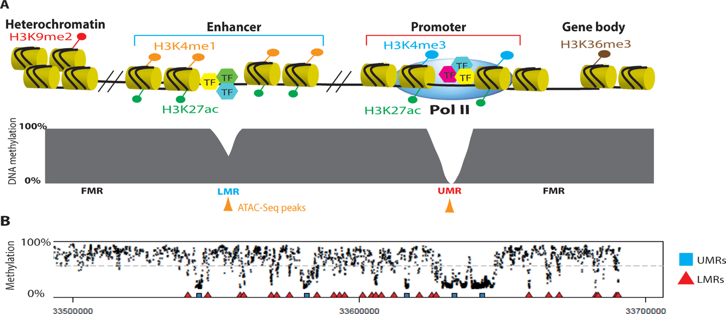 Figure 2 Epigenetic landscape. (A) Genomic distribution of the main epigenetic marks. Histones are depicted as yellow cylinders; black lines represent DNA, and modifications of histone tails are shown as circles. Transcription factors (TF) are indicated by hexagons. Grey blocks represent DNA methylation patterns. UMRs, LMRs and FMRs show the unmethylated regions, low-methylated regions and fully methylated regions, respectively. Assay for transposase-accessible chromatin using sequencing (ATAC-Seq) peaks are depicted in orange. (B) Genome browser snapshot illustrating DNA methylation patterns. ac: acetylation; H: histone; K: lysine; me: methylation; Pol II: RNA polymerase II.
