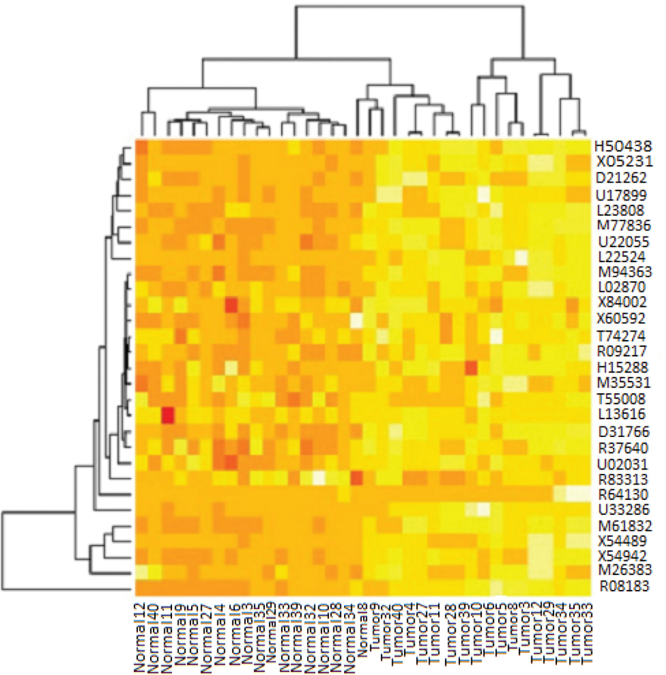 Figure 4 Cluster map derived from two-way cluster analysis with the hierarchical method. We combined 29 common genes in tumor and normal tissues in a matrix. Clustering was performed on this matrix. Each color patch on the cluster map indicates the expression intensity level of the associated gene in that tumor and normal tissue samples. The color patches on the cluster map have continuity on expression levels from yellow, that is, highest, to red, that is, lowest (11).
