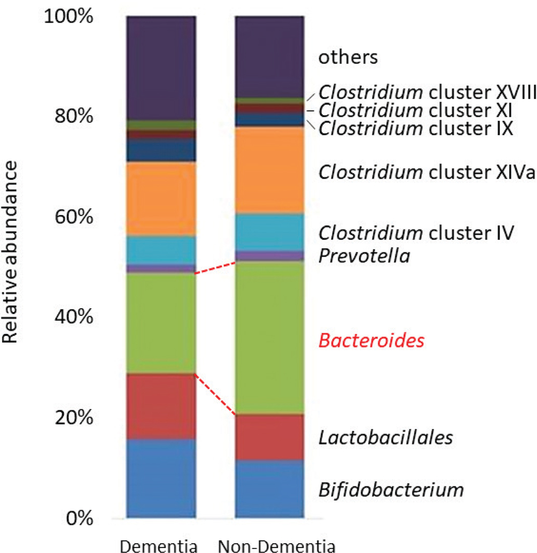 Figure 1 Relative bacterial abundance in the gut microbiota of dementia and non-dementia patients. It was suggested that a lower prevalence of Bacteroides is seen in the gut of dementia patients than non-dementia patients (50).