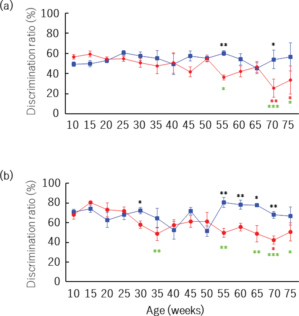 Figure 2 Novel object recognition test in mice transplanted with microbiota. (A) Ratio of time spent exploring a familiar object in a new location to time spent exploring a familiar object in an old location. (B) Ratio of time spent exploring a novel object to time spent exploring a familiar object. Blue and red lines indicate the ratio of time spent by mice transplanted with microbiota from a healthy donor and a patient with Alzheimer’s disease, respectively. Black, * and ** indicate comparison between groups; red,* and ** indicate mice transplanted with microbiota from a patient with Alzheimer’s disease had significantly altered cognitive function at respectively weeks of age compared with that at 10 weeks of age; green, *, **, and *** indicate mice transplanted with microbiota from a patient with Alzheimer’s disease had significantly altered cognitive function at respectively weeks of age compared with that at 15 weeks of age. Data are mean ± SEM. *, p < 0.05; **, p < 0.01; ***, p < 0.001 (57).