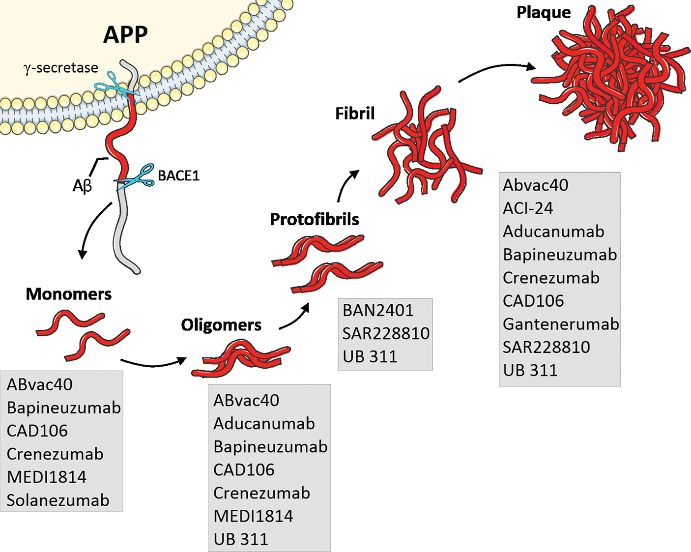 Figure 1 Proposed targets of anti-amyloid-β (Aβ) drugs used in active and passive immunization approaches (modified from (2)).