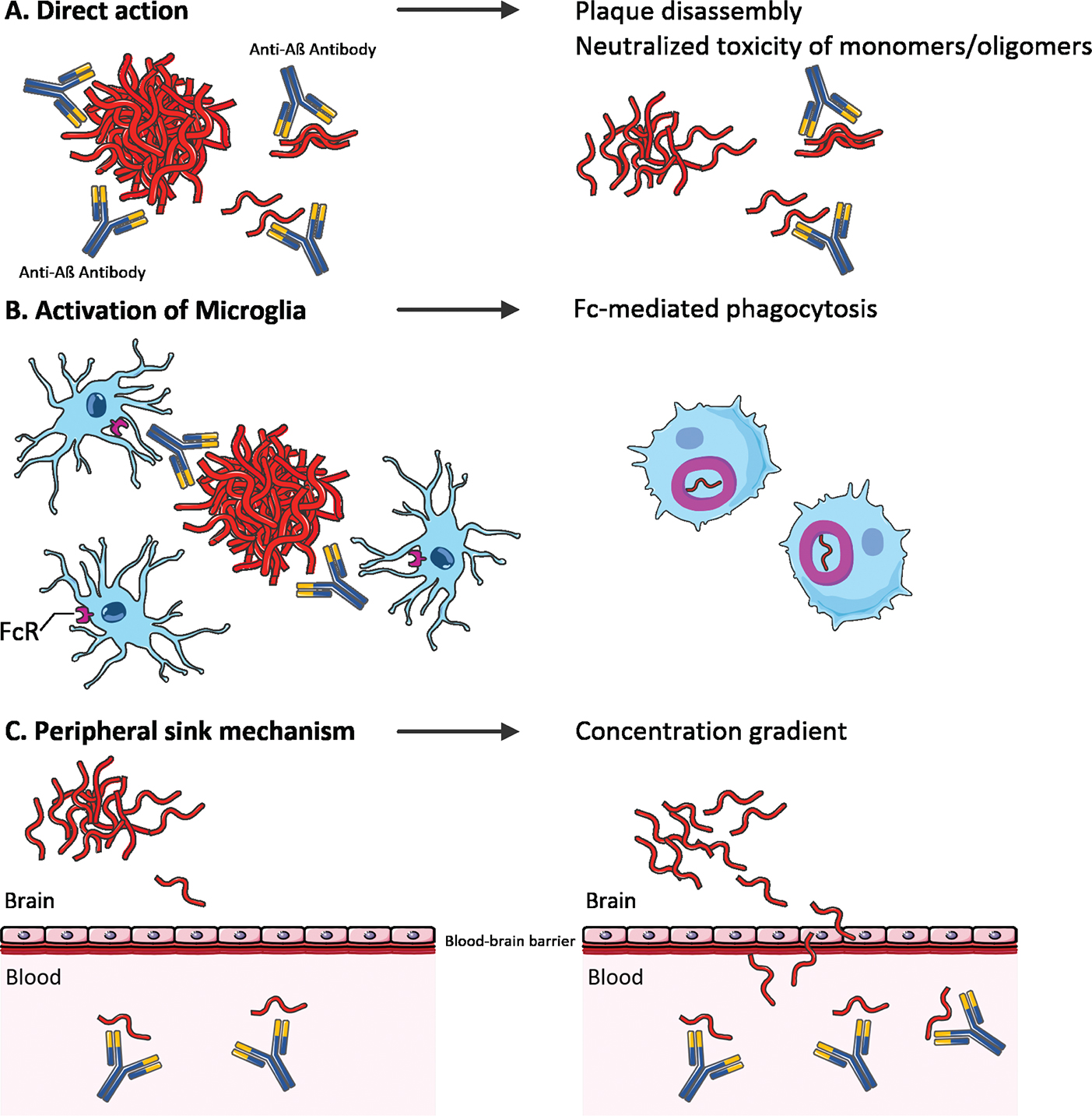 Figure 2 Proposed mechanisms of anti-amyloid-β (Aβ) antibodies. Antibodies might either directly target Aβ assemblies, leading to a neutralization of Aβ toxicity (A), or activate microglia, resulting in Fc-receptor (FcR) mediated phagocytosis (B). Alternatively, antibodies might not enter the brain but create a concentration gradient between the brain and the blood, leading to Aβ removal via a peripheral sink mechanism (C) (modified from (121)).
