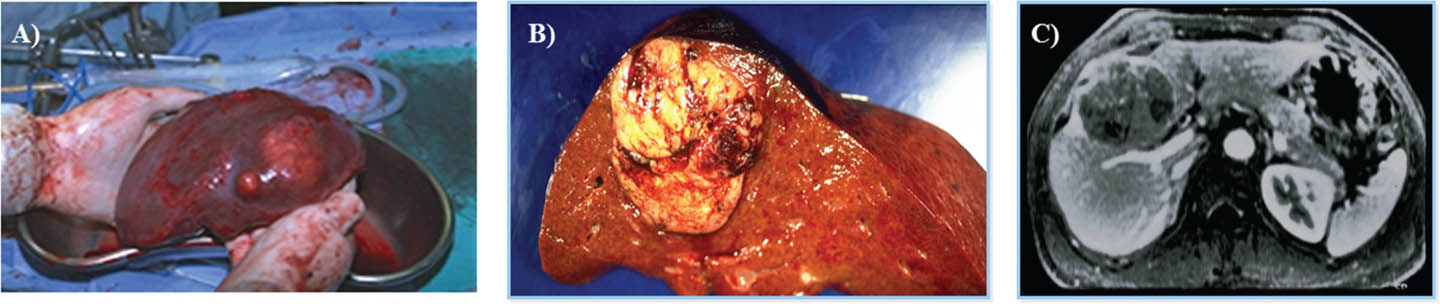 Figure 5. Liver imaging and pathology specimen after liver resection for hepatocellular carcinoma. A. A right tri-segmentectomy was performed. B. Tumor was removed, note the clear margins. C. MRI, showing the large HCC with multiple satellite lesions before resection. The patient did well after surgery, and she was discharged home 5 days after procedure, with no evidence for recurrences at 2 years follow up.