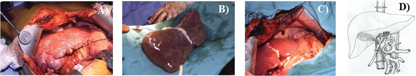 Figure 6. Liver transplant procedure in a patient with end stage liver disease. A. Liver with advanced fibrosis is removed. B. Replaced with a liver graft form a deceased donor. C. Reperfusion showing satisfactory appeaance. D. Classic vascular and biliary reconstruction performed at the proximal and distal end:end caval anastomosis, porto:portal and common hepatic to common hepatic arterial reconstruction. In this case, no blood products were given to the patient during the procedure. The patient was discharged 6 days after surgery. The patient is alive and doing well 5 years after graft implantation.