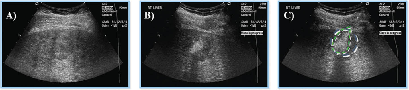 Figure 8. Ultrasound-guided percutaneous alcohol injection of hepatocellular carcinoma. A and B. Under image-guidance by US, administration of ethanol (97%) is performed into the tumor. C. Noting an enlarging hyperechoic signal. Although the procedure in well-trained hands is reliable and practical for large scale application, malignant recurrence rates are high.