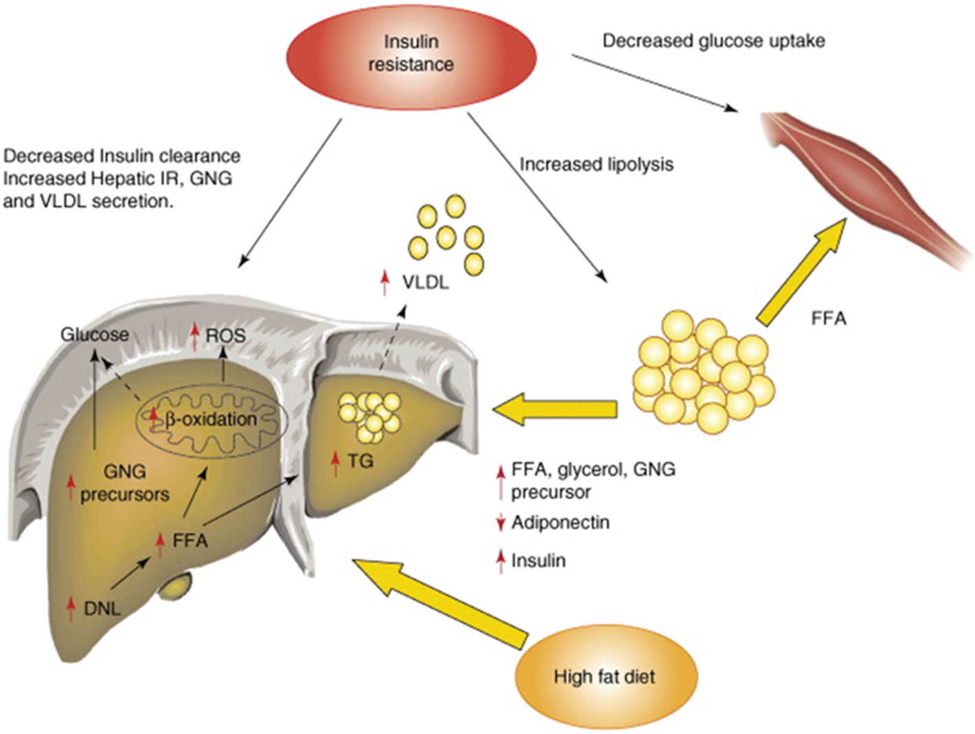 Figure 2. Mechanisms of fat accumulation in non-alcoholic steatohepatitis. Insulin resistance causes an influx of FFAs to the liver, owing to increased lipolysis, especially in the visceral adipose tissue. Increased de novo lipogenesis and fat from the diet also contribute to the fatty-acid pool. Both VLDL generation and FFA oxidation are increased and are enough to prevent intrahepatic lipid accumulation. DNL, de novo lipogenesis; FFA, free fatty acid; GNG, gluconeogenesis; IR, insulin resistance; ROS, reactive oxygen species; TG, triglycerides; VLDL, very low-density lipoproteins (23).