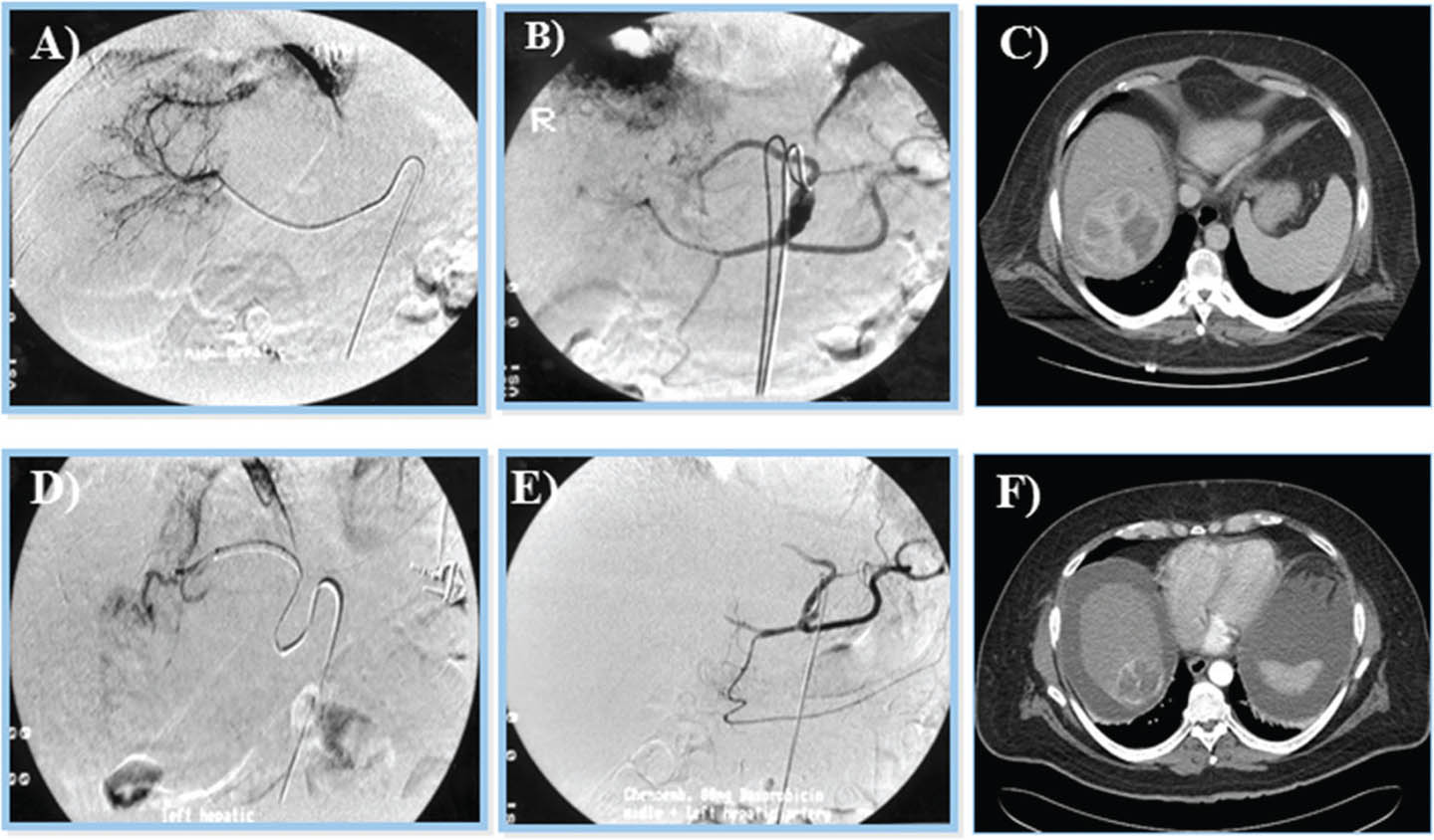 Figure 10. Trans-arterial chemoembolization of the liver for hepatocellular carcinoma. A and B. Selective arterial embolization of the vessels feeding the tumor in the liver. C. Tumor visualized by CT scan. The procedure is performed with or without chemotherapy. D and E. After embolization, angiography showed obliteration of feeding vessels with shrinkage of the tumor. F. Follow up CT scan after embolization. Note an increase in patient’s ascites.