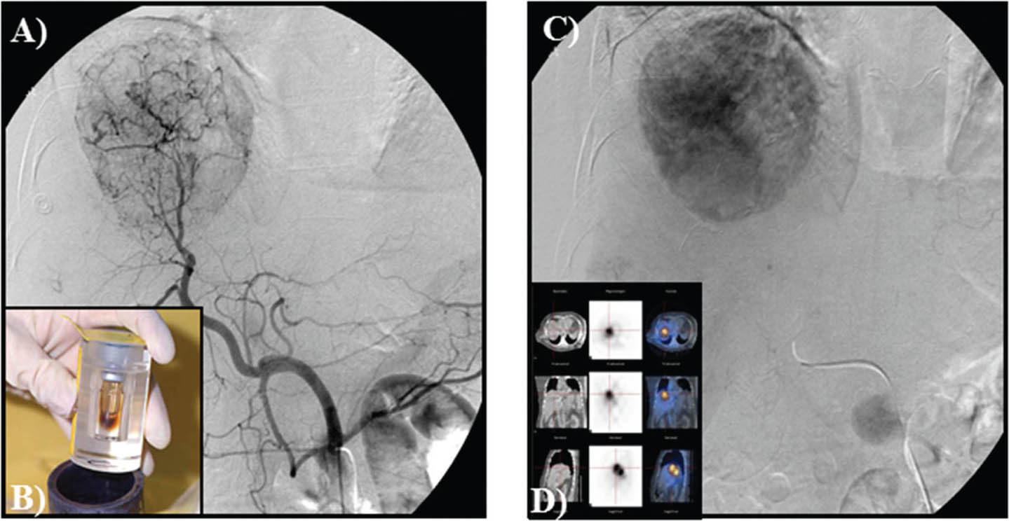 Figure 11. Y-90 embolization for hepatocellular carcinoma. A. Selective angiography of the liver and detection with obliteration of systemic shunts is performed. B, C and D. Micro-spheres then are embolized to the liver with no vessel occlusion.