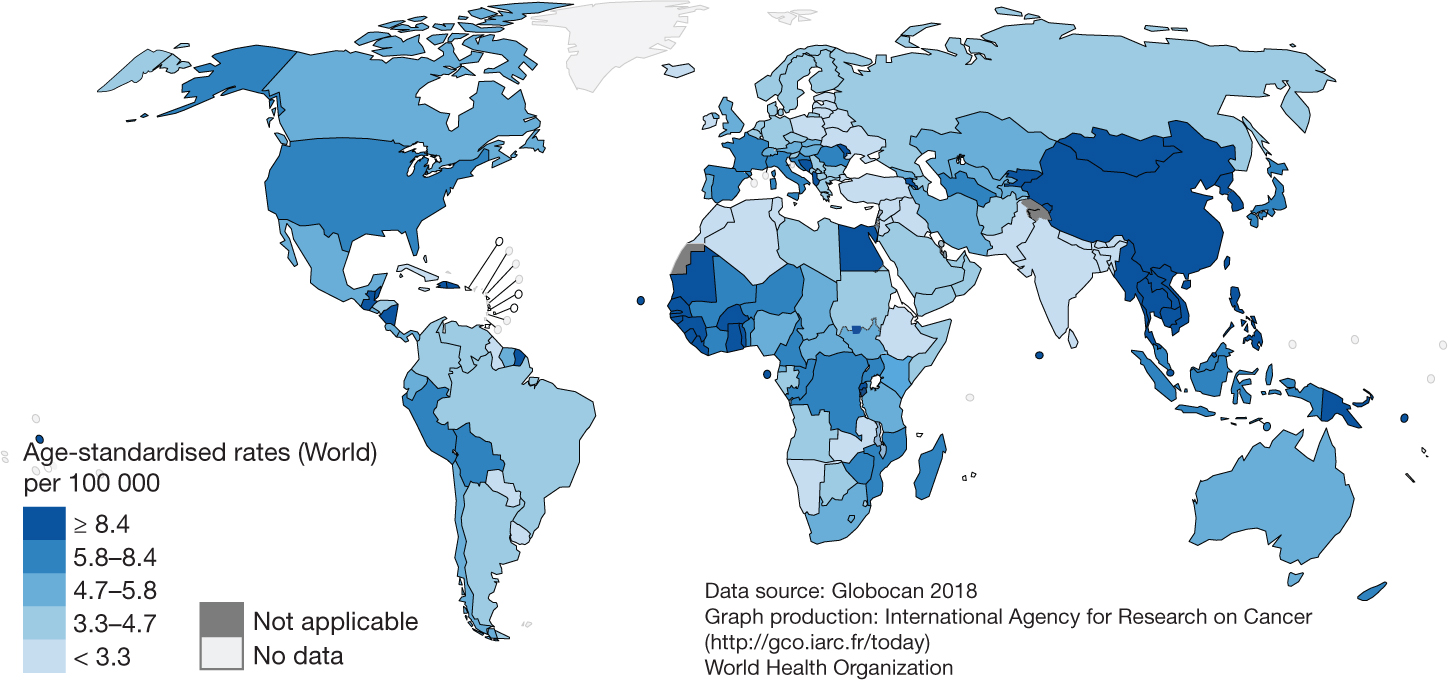Figure 1. Global estimates of hepatocellular carcinoma. Estimated age-standardized incidence rates in both sexes for liver cancer in 2018 (3).