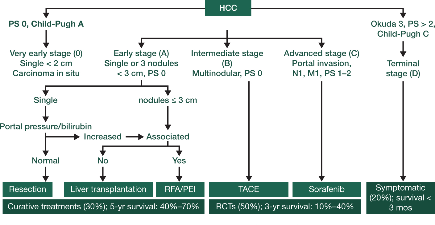 Figure 4. Staging system for hepatocellular carcinoma. The Barcelona group developed a staging system for HCC that includes five stages, given recommended therapy for each stage and change of cure and overall survival (61).
