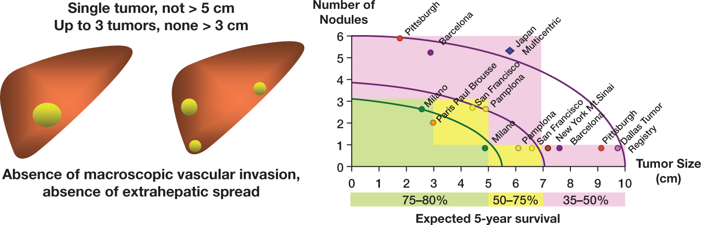Figure 7. The Milan criteria for liver transplantation in patients with end-stage liver disease and hepatocellular carcinoma. Patients with end-stage liver disease and hepatocellular carcinoma are entered into the liver transplant waiting list if they fulfil the Milan criteria, which includes one tumor <5 cm in major diameter, or a maximum of 3 tumors with the largest <3 cm in major diameter. In addition, the patient should have no vascular invasion or evidence of extrahepatic disease. Other groups have explored other criteria with the development of the metro-ticket concept that evaluates the probability of overall survival after liver transplantation in patients with tumor burden over the Milan criteria (70).