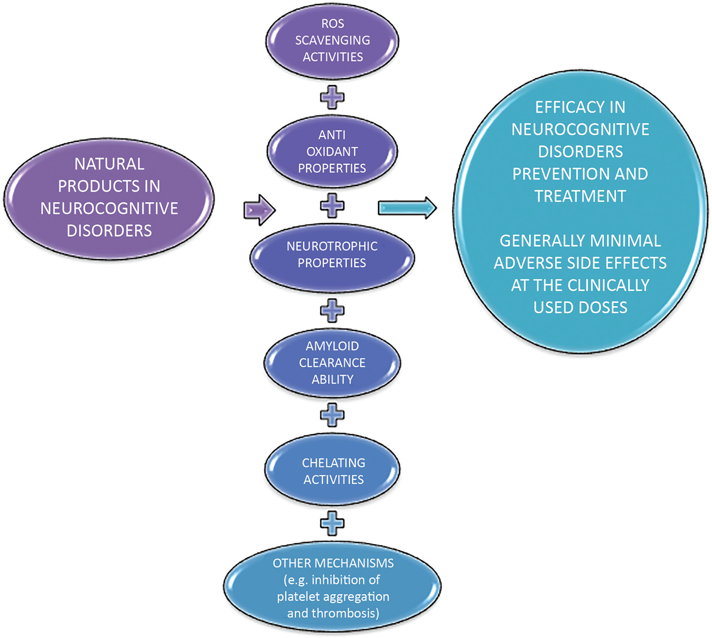 Figure 1 Natural products for neurocognitive disorders. The neuroprotective effects of natural products are largely attributed to their free radical scavenging abilities. In addition, they can chelate metals, inhibit amyolid beta formation, and enhance its clearance. In general, the natural products exert minimal or lower-grade adverse events.