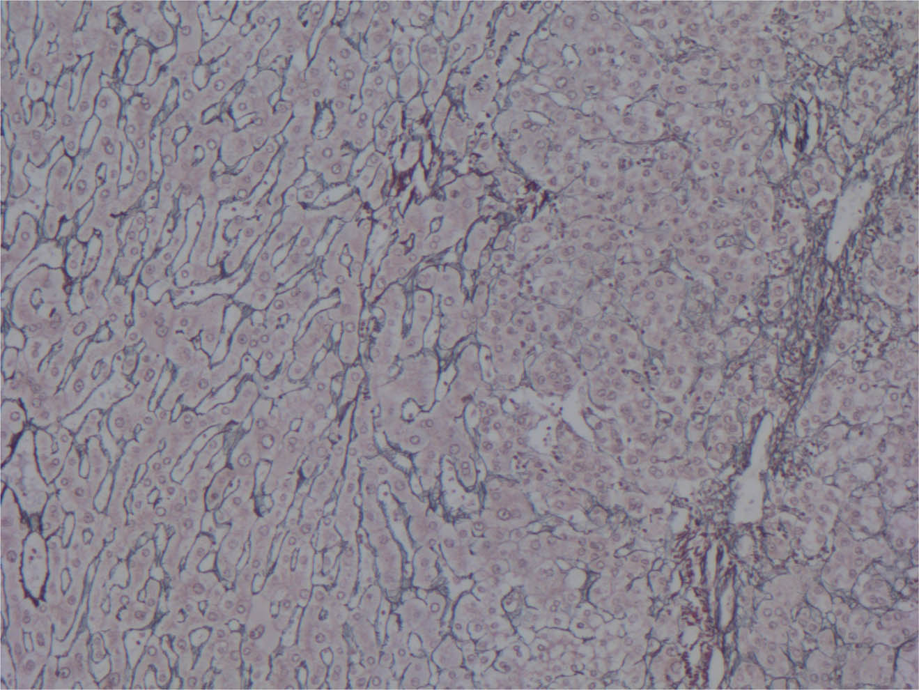 Figure 2. Reticulin stain 200X. On the left, normal hepatocytes with one to two cell thick hepatic plates as compared to hepatocellular carcinoma (on the right) with distended hepatic plates.
