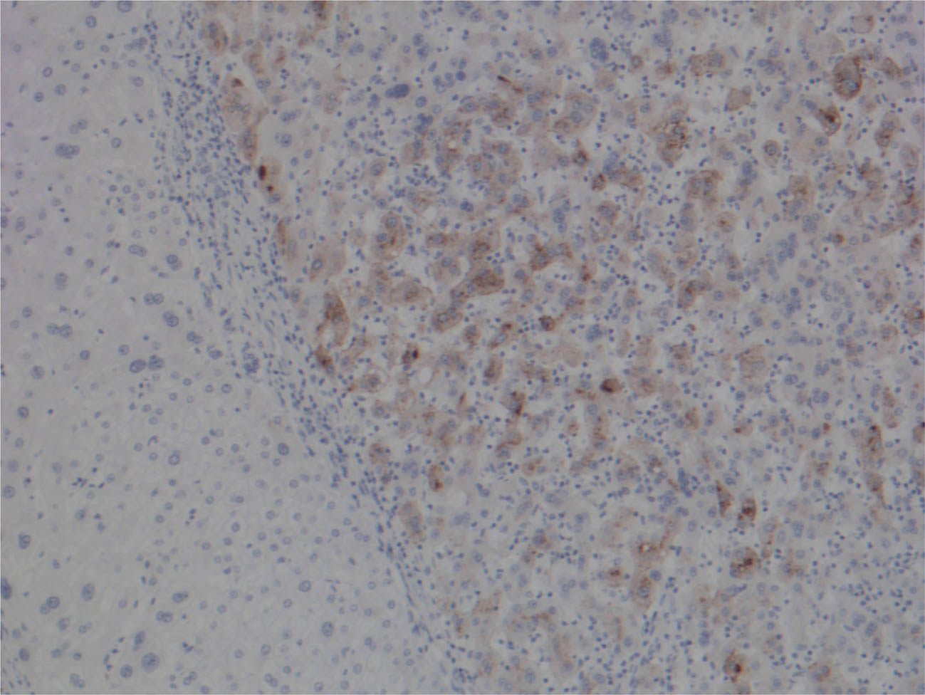 Figure 3. Immunohistochemistry for Glypican- 3 200X. On the left, normal hepatocytes with no staining (brown pigmentation) as compared to hepatocellular carcinoma (on the right) with cytoplasmic and few nuclei staining positive (brown discoloration).