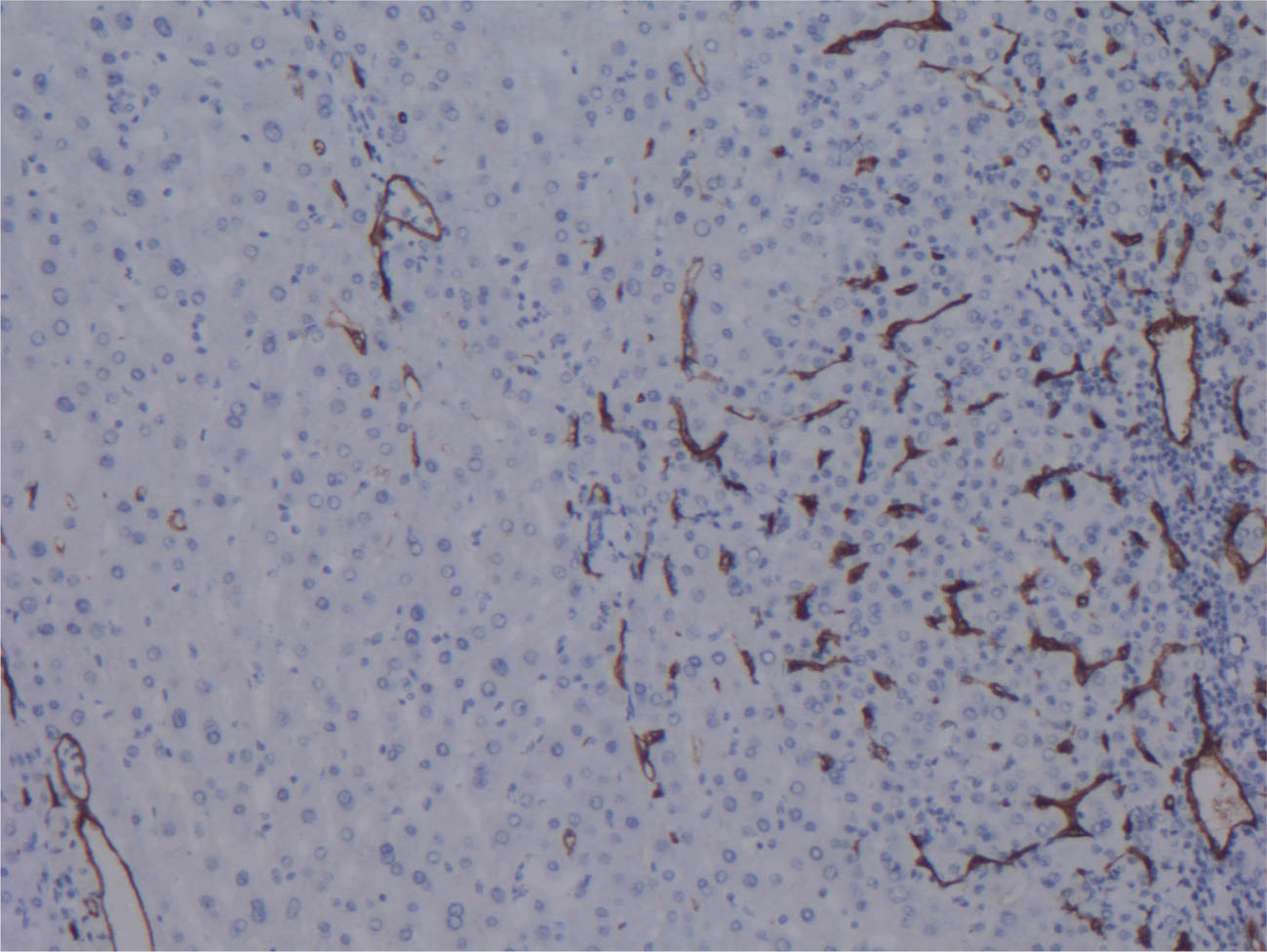 Figure 4. Immunohistochemistry for CD34 200X. On the left, normal hepatocytes with no staining (brown discoloration) of the sinusoids as compared to hepatocellular carcinoma (on the right) with positivity within the sinusoids indicating capillarization.