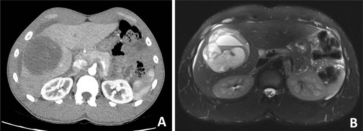 Figure 1. Radiology of undifferentiated embryonal sarcoma of the liver (UESL). A. An arterial phase contrast-enhanced computed tomography from a young adult male with UESL. It demonstrates a large hypodense mass in the right lobe of the liver. B. Magnetic resonance image showing a large mass in right lobe of the liver with heterogenous and cystic features along with fluid-fluid levels.