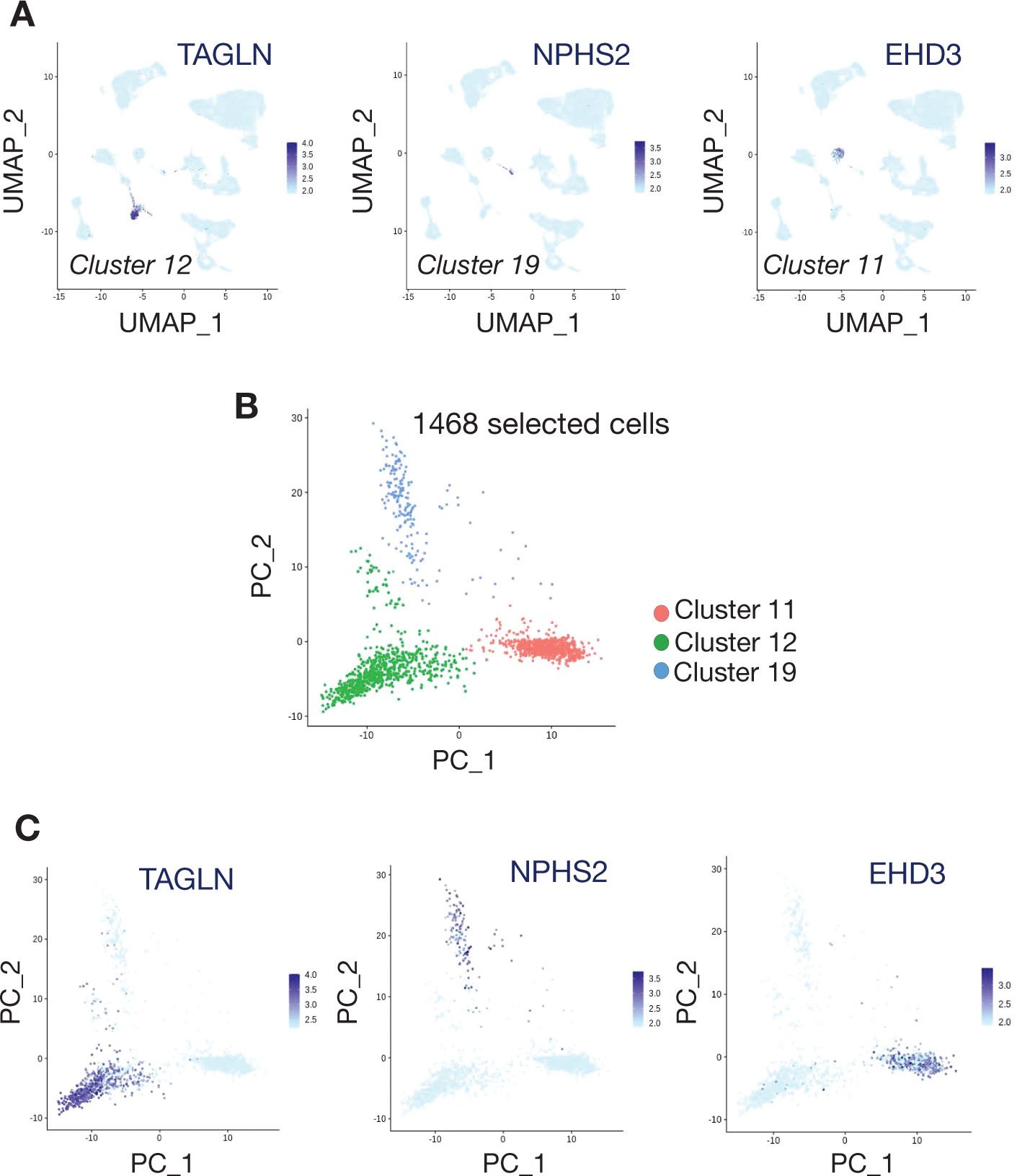 Figure 4. Kidney single cell transcriptome subsetting to select glomerular cells of interest. A. UMAP dimensional reduction showing the respective expression of TAGLN in cluster 12, NPHS2 in cluster 19 and EHD3 in cluster 11. B. Principal component analysis after subsetting clusters 11, 12 and 19. C. Respective levels of expression of TAGLN, NPHS2 and EHD3 in principal component analysis after subsetting on clusters 11, 12 and 19.