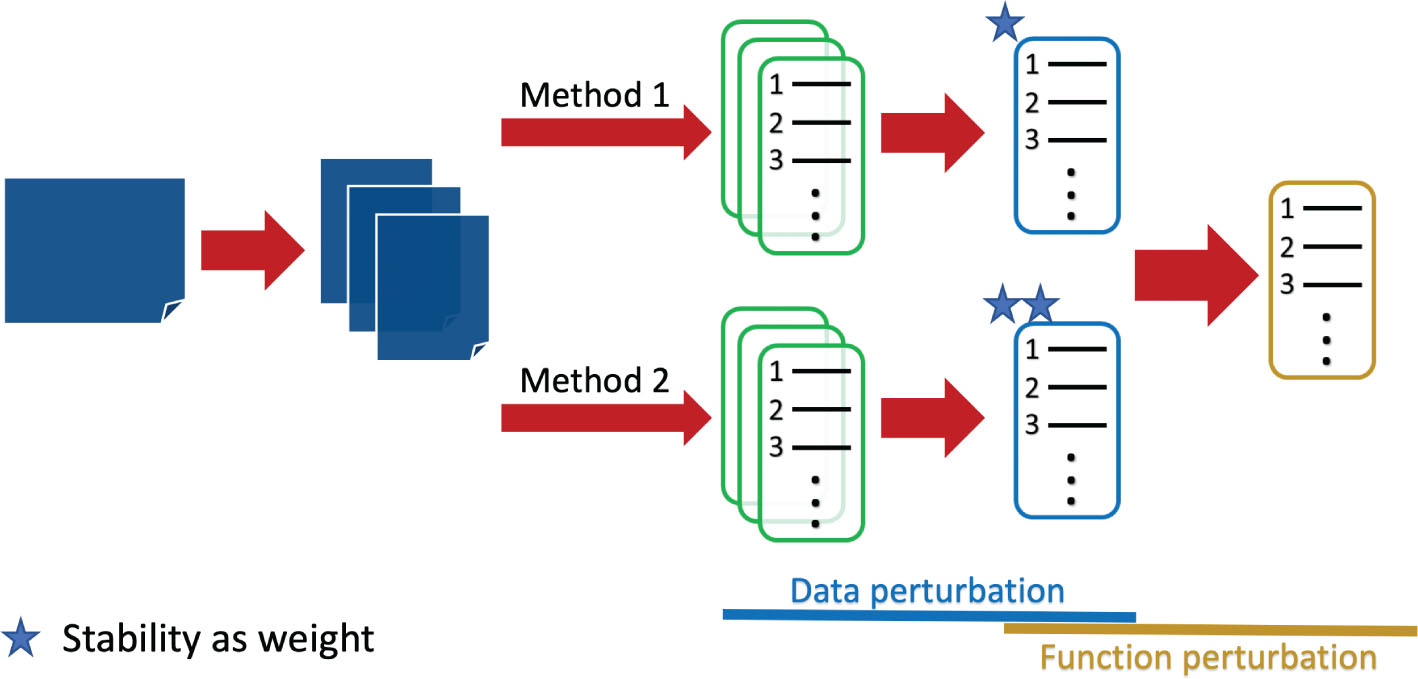Figure 2. Combination of both data perturbation and function perturbation. The original dataset is subsampled into several sub-datasets. The genes are ranked based on each of them using different methods. In the data perturbation phase, the ranked gene lists are integrated into one ranked list and meanwhile, the stability of each method is calculated. In the phase of function perturbation, the results from different methods are combined using methods’ stabilities as weights.