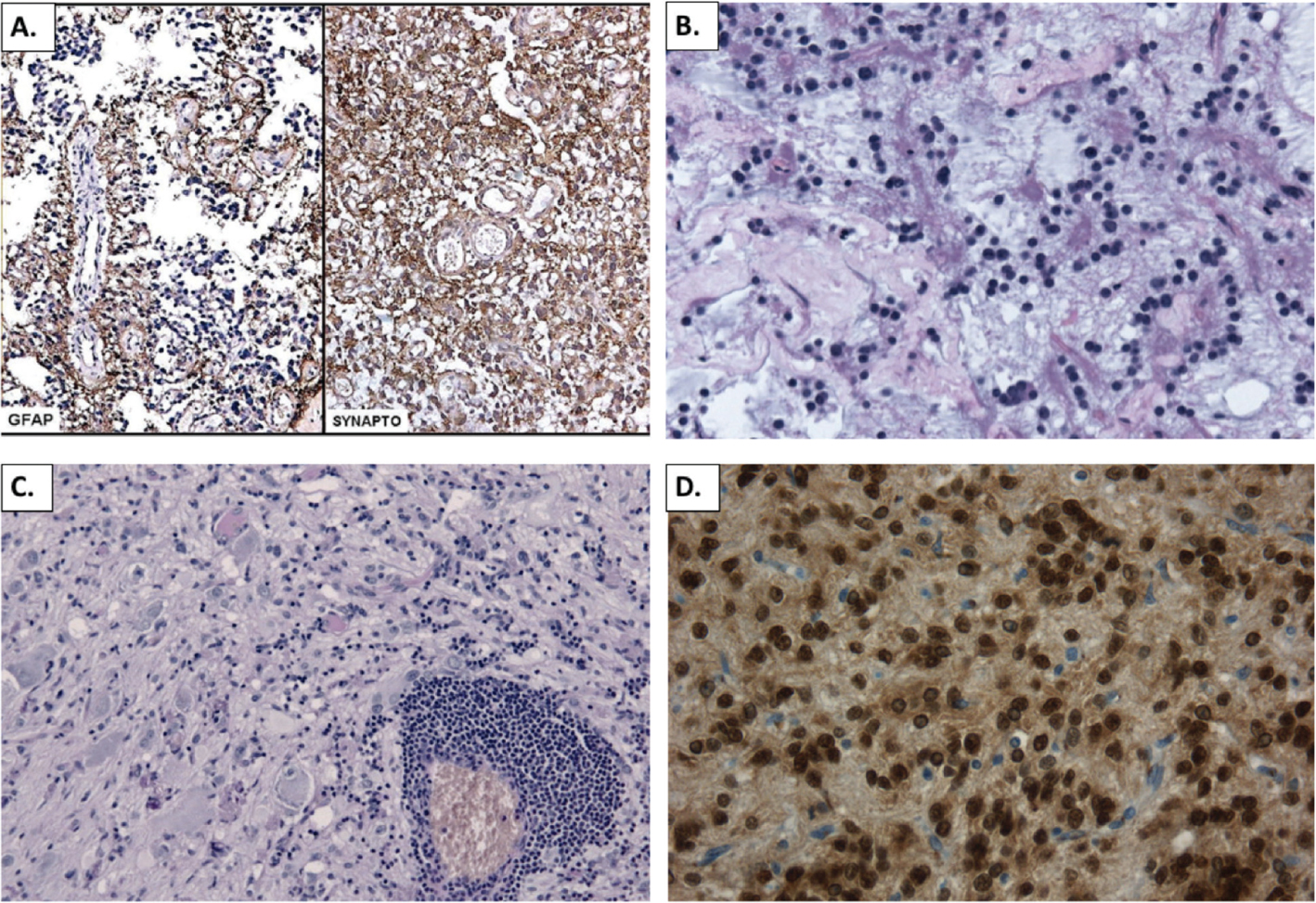Figure 2. Pathologic features of glioneuronal tumors. A. Histopathology of papillary glioneuronal tumor (PGNT): the pseudopapillae formed by glial fibrillary acid protein (GFAP)-positive cells and synaptophysin (SYNAPTO)-positive neuronal cells forming solid areas. (adapted from 52). B. Histopathology specimen (HE stain) of a RGNT (rosette-forming glioneuronal tumor; adapted from 53). C. PAS stain of a ganglioglioma displaying perivascular lymphocytic infiltrates and weakly PAS-positive eosinophilic granular bodies (x100 magnification; adapted from 54). D. Histopathology of Neurocytoma. Immunohistochemistry for NeuN showing neuronal differentiation of tumor cells adapted from 55).