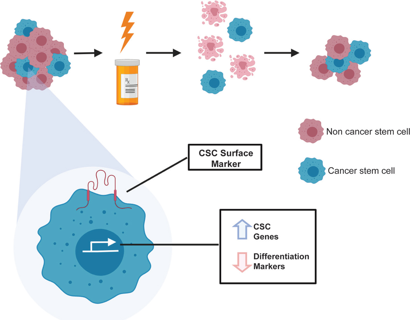 Figure 1. Pediatric brain tumor CSC phenotypes and genotypes. Pediatric brain tumors are heterogeneous in nature, containing both CSCs and non-CSCs. When bulk tumors are treated, with either radiotherapy or chemotherapies, the radio- and chemo-resistant CSC subpopulation remains and can repopulate the tumor. CSCs can be sorted from bulk tumors by cell surface markers, such as CD133. CSCs have intrinsic characteristics such as gene regulation that keep them in a progenitor/stem state via upregulation of stem genes and downregulation of genes related to a more differentiated cell state. These changes give CSCs the ability to self-renew and initiate tumor formation, thereby contributing to tumor recurrence. Differential gene regulation from non-CSCs is also thought to contribute to CSC therapeutic resistance, with DNA damage repair genes and drug efflux transporters upregulated, while pro-apoptotic pathways are downregulated. Created with BioRender.com.