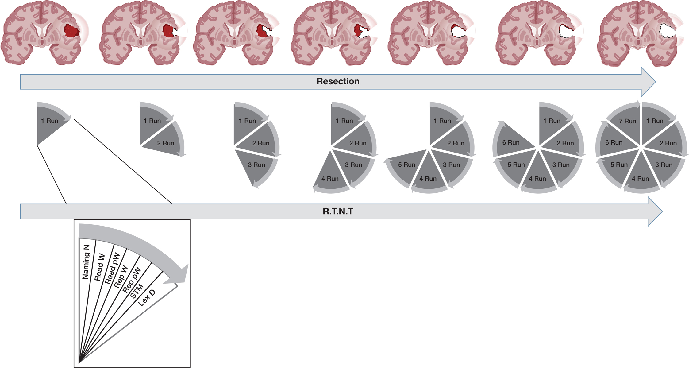 RTNT comprises of a continuously repeated sequence of neuropsychological tests for lexical comprehension, picture naming, repetition, limb apraxia, short-term memory and reading. Tests are presented in a fixed order. For example, it can start with object naming, then jump to phonemic discrimination, then to word reading, and to word repetition, followed by pseudoword reading, pseudoword repetition, later to phonological discrimination, digit-span, and lastly to lexical decision, and action naming. Each of the test includes a list of 10 stimuli. Once a sequence of test is completed, the sequence is repeated, yet with a different stimulus list (Figure 2). This test repetition and alternation continues until the end of resection. When the patient completes the test at the same level as pre-surgery, resection continues (Figure 3). As soon as the neuropsychologist detects a decrement vs. the 70% threshold, the neurosurgeon is informed.