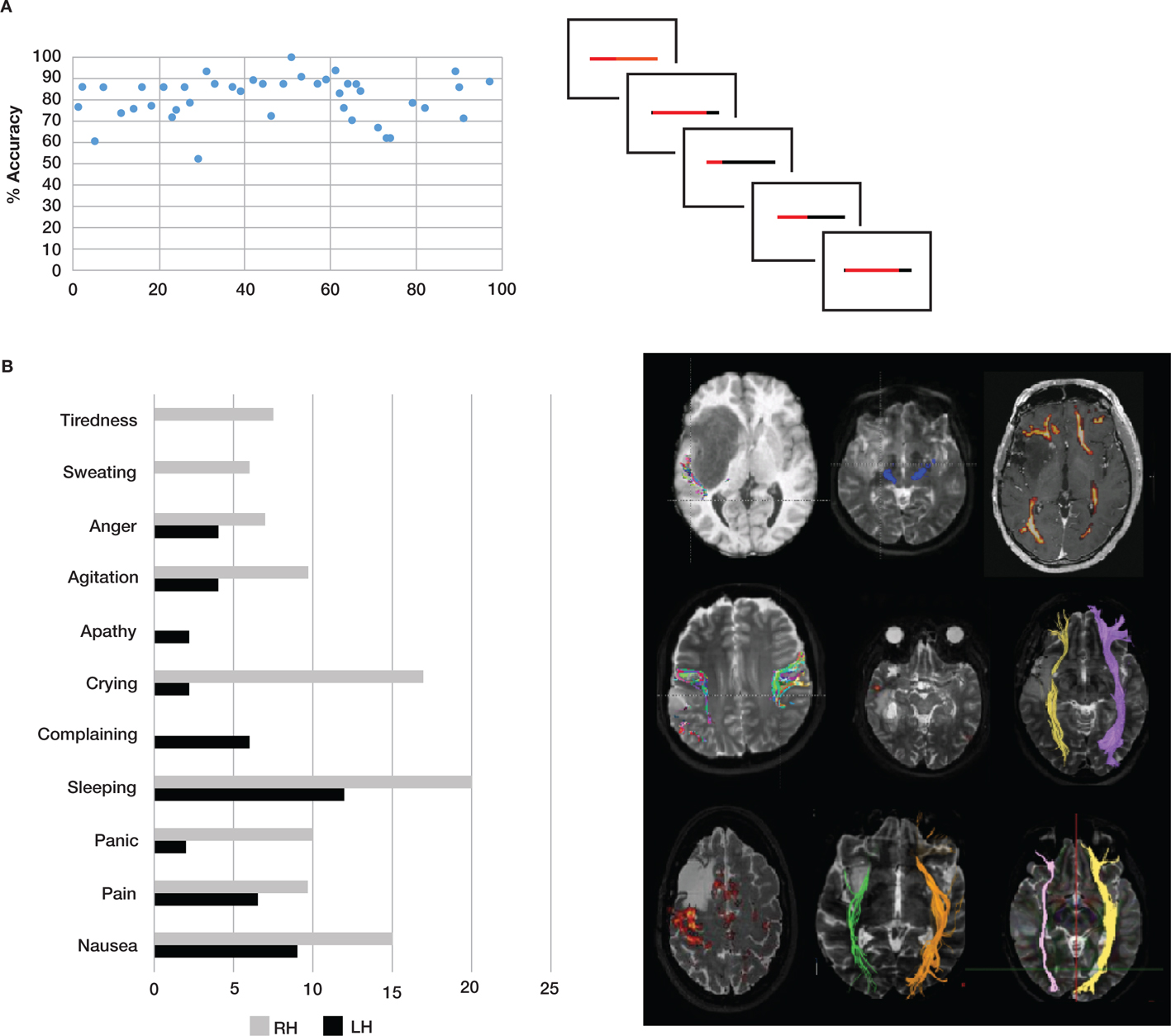 Figure 4. Patients’ overall accuracy. A. Milner Landmark Test, and an example of the different items with shorter (black) or longer segments (red). B. Patients (%) showing behaviors or neurophysiological manifestations, and examples of the lesion localization in patients with right hemisphere lesions showing such phenomena.