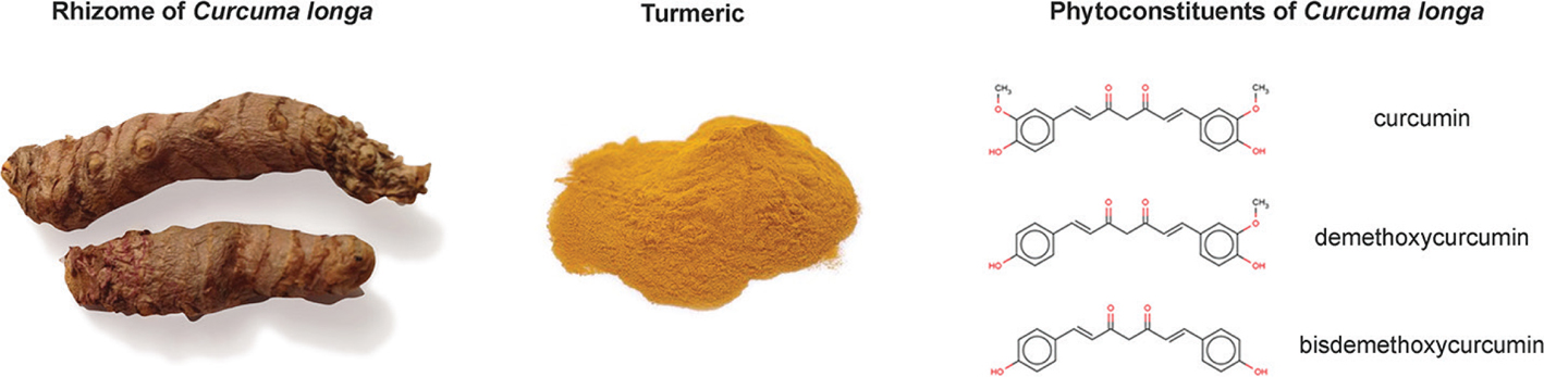 Figure 1. Curcuminoids extracted from the rhizome of turmeric (Curcuma longa) and molecular structures of the three phytoconstituents: curcumin, demethoxycurcumin, and bisdemethoxycurcumin.