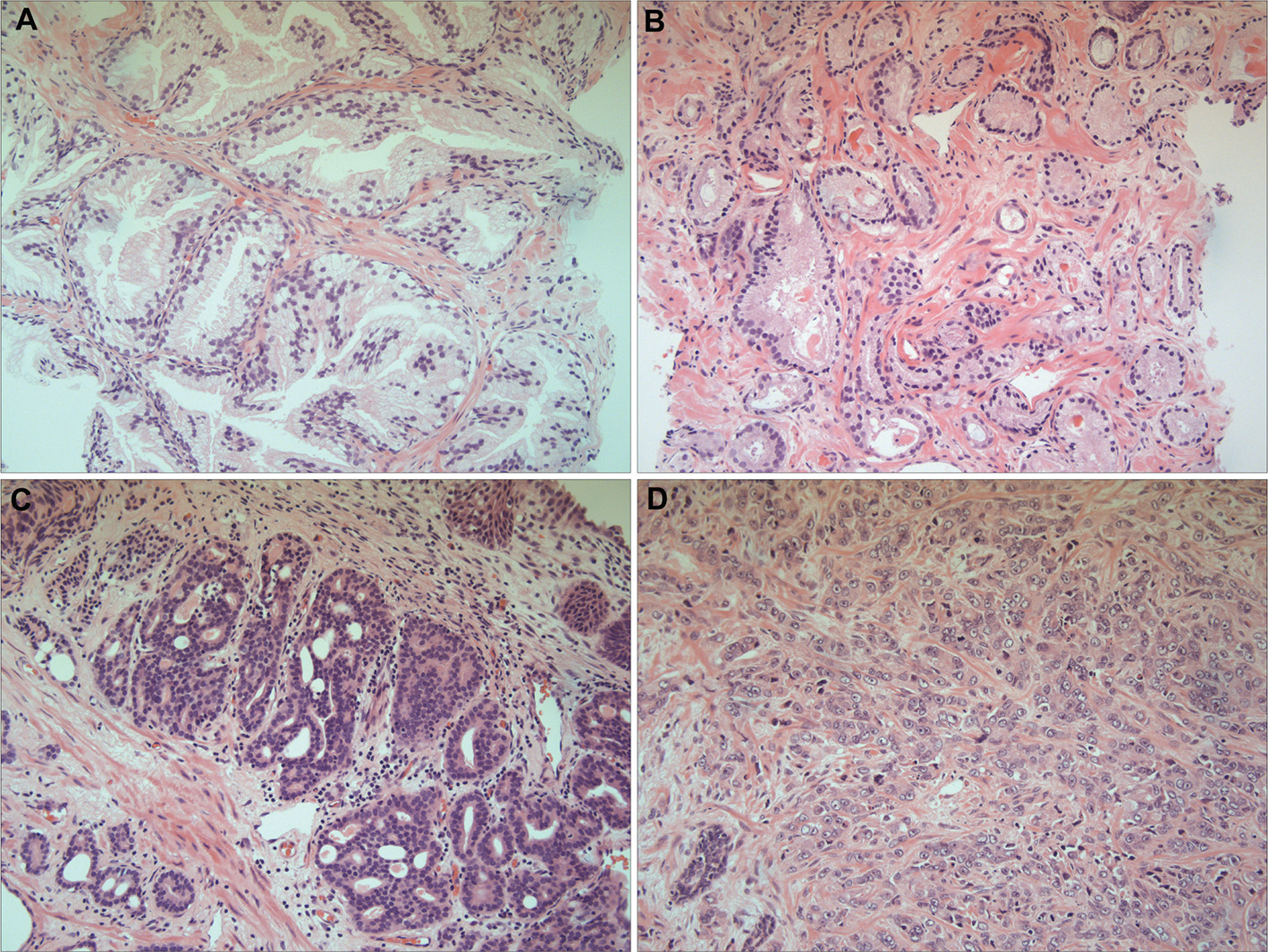 Figure 1. Prostate histology in Gleason grading groups. Gleason scoring allows physicians to predict the prognosis of patients by assessing the histological patterns of their disease. A. Normal prostate tissue showing well-formed and well demarcated glands. B. Grade Score 3 prostatic glands are well-formed and individualized meaning they are well delineated with a clear stroma. C. Gleason Score 4 glands become fused together, are poorly formed, and show a cribriform pattern. D. Gleason Score 5 there is a lack of gland formation and the presence of individual cells. This particular section also demonstrates cytoplasmic vacuoles. (Images kindly provided by Dr. Maria Bahhadi-Hardo, Consultant Histopathologist, Frimley Park Hospital, Frimley Surrey, UK).