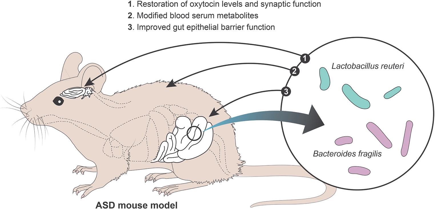Figure 2. The effects of microbial-based therapies on mouse models of ASD (65, 66). Introduction of bacteria such as Lactobacillus reuteri and Bacteroides fragilis in mouse models of ASD have been shown to restore oxytocin levels and synaptic function in the brain, modify and restore blood serum metabolites and improve the gut epithelial barrier function.