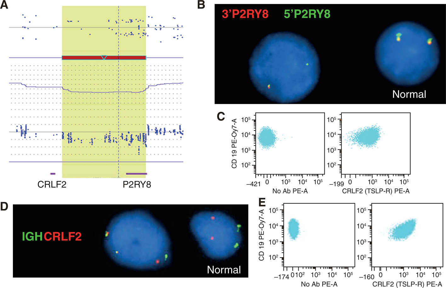 Figure 3. Cytogenetic and flow cytometry findings of B- ALL with CRLF2 rearrangement. A, SNP-Array analysis shows CRLF2-P2RY8 fusion. B, FISH analysis using P2RY8 break-apart probes demonstrates 3′P2RY8 deletion. C, Flow cytometry study shows CRLF2 expression. D, FISH analysis using IGH and CRLF2 fusion probes demonstrates IGH-CRLF2 fusion. E, Flow cytometry study shows CRLF2 expression. A, B and C from one case; D and E from another case.
