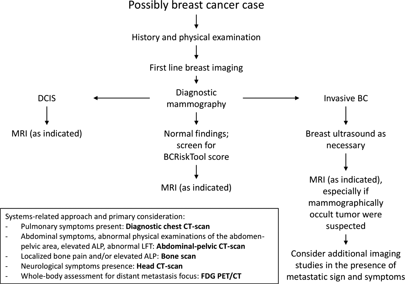 Figure 4. Imaging algorithm of breast imaging in pre-treatment phase of management as adapted from NCCN 2022 guidelines. Abbreviation: ALP, alkaline phosphatase; LFT, liver function test (70).