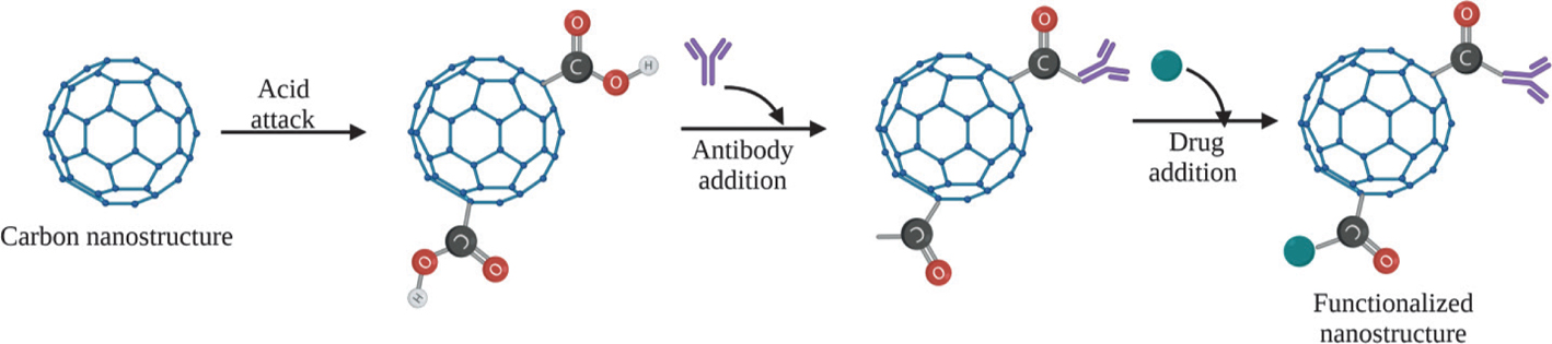 Figure 3. Functionalization of carbon nanostructures. Example of the functionalization of carbon nanostructure adding an antibody and a drug. First, carbon nanostructure suffers an acid attack to carboxylate the structure, after that, antibodies are added in some carboxile groups to recognize the target cells, and finally, the drug is added to functionalize the nanostructure. This figure was created by using BioRender.com