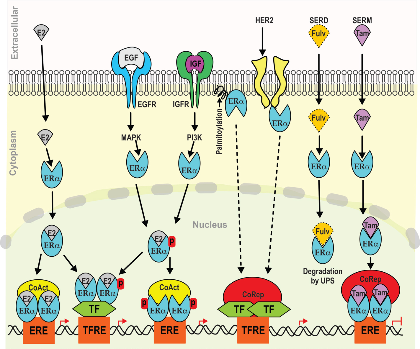 Figure 1. Signaling of ERα in breast cancer cells. ERα exhibit multiple localizations including the nucleus, cytoplasm, and membranes. In the cytoplasm, it is associated with cytoplasmic proteins, and in the membrane through palmitoylation or transmembrane receptors (e.g., HER2). Estradiol (E2) activates ERα, promoting its accumulation in the nucleus, where the ERα regulates the expression of E2-target genes. E2 and growth factors (EGF and IGF) can induce ERα phosphorylation and promote its transcriptional activity. Fulvestrant and tamoxifen are anti-estrogens that bind to ERα to mediate either its degradation or the repression of its target genes, respectively.