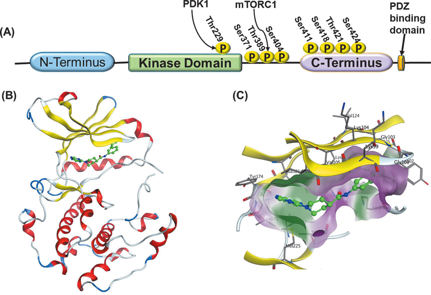 Figure 1. p70 S6K1 structure and schematic overview of S6K1 activating phosphorylation sites. A, p70S6K1 isoform, structure, and domain organization with phosphorylation sites. Residues phosphorylated by 3-phosphoinositide-dependent kinase 1 (PDK1) (Thr229) and mammalian target of rapamycin (mTORC1) (Thr389) are identified. B, The ribbon model of the kinase domain of S6K1 bound to the ligand 1-(9H-purin-6-yl)-N-[3-(trifluoromethyl)phenyl]piperidine-4-carboxamide adapted from reported crystal structure ‘3WF7.pdb’. C, Molecular surface depiction of the ligand binding pocket (3WF7.pdb) colored by lipophilicity (green) and hydrophilicity (purple) and the residues lining the pocket labeled in black.