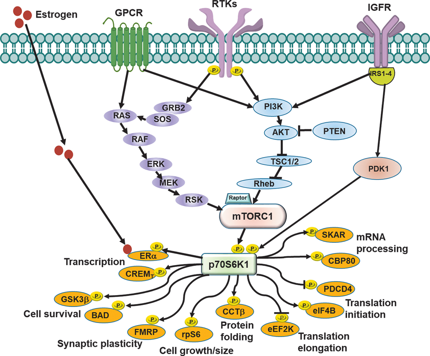 Figure 2. S6K1 is activated by coordinated phosphorylation by mTORC1 and PDK1. Growth factors, mitogens, and amino acids activate S6K1 through the PI3K/AKT/mTORC1, MAPK, IRS pathways. Activated S6K1 regulates several cellular processes by phosphorylation of substrates: mRNA processing via S6K1 Aly/REF-like target (SKAR), nuclear cap-binding protein subunit 1(CBP80); cap-dependent translation initiation via programmed cell death protein 4 (PDCD4) and eukaryotic translation initiation factor 4B (elF4B); translation elongation via eukaryotic elongation factor 2 kinase (eEF2K); protein folding via T-complex protein 1 subunit beta (CCTβ); cell growth/size via ribosomal protein S 6 (rpS6); synaptic plasticity via fragile X mental retardation protein (FMRP); cell survival via glycogen synthase kinase β (GSK3β), Bcl-2-associated death promoter (BAD); transcription via transcription factors estrogen receptor alpha (ERα) and cAMP-responsive element modulator (CREMT). ERK, extracellular-signal-regulated kinase; GPCR, G-protein coupled receptor; GRB2, growth factor receptor bound protein 2; IGFR, insulin growth factor receptor; IRS1-4, insulin receptor substrate 1–4; MEK, mitogen activated protein kinase kinase; PTEN, phosphatase and tensin homolog; PI3K, phosphoinositide 3-kinase; AKT, protein kinase B; RAF, rapidly accelerated fibrosarcoma; Rheb, Ras homolog enriched in brain; RAS, rat sarcoma virus; RTKs, receptor tyrosine kinases; RSK, ribosomal protein S6 kinase; SOS, son of sevenless; TSC1/2, tuberous sclerosis complex ½.